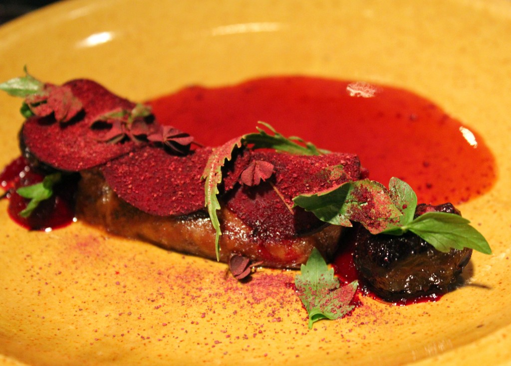 Viininä oli Meyer-Näkel ”S” Spätburgunder, joka oli kierroksemme Späteistä suosikkini. Viini oli Spätburgunderiksi yllättävän vahva ja kirsikkainen ja pärjäsi hyvin tummalle lihalle. Sommelier Humberto Pulido Garcés kertoi viinin lasihinnaksi 12 euroa. Hellaan voi siis poiketa vaikka vain viinilasilliselle nyt Riesling- ja Spätburgunderviikoilla. Tämä Spät oli niin hyvä ja lasihinta niin kohtuullinen, että suosittelen.