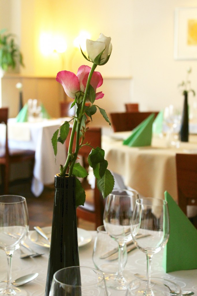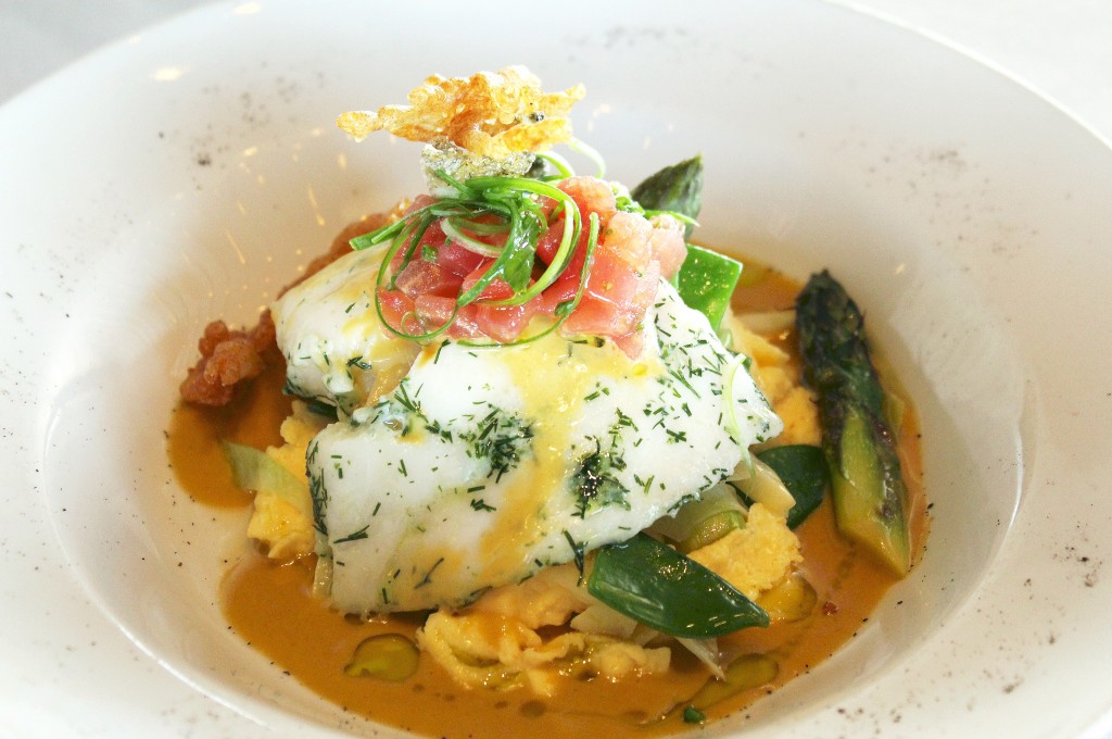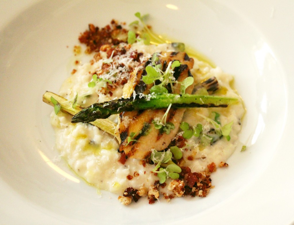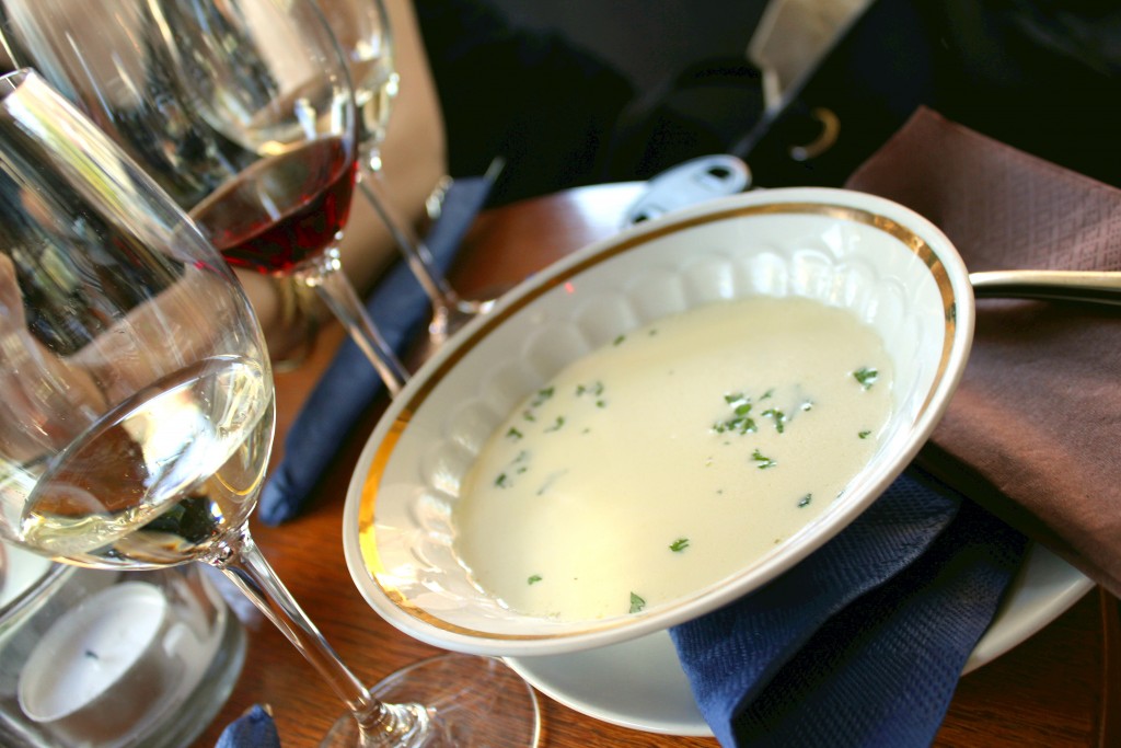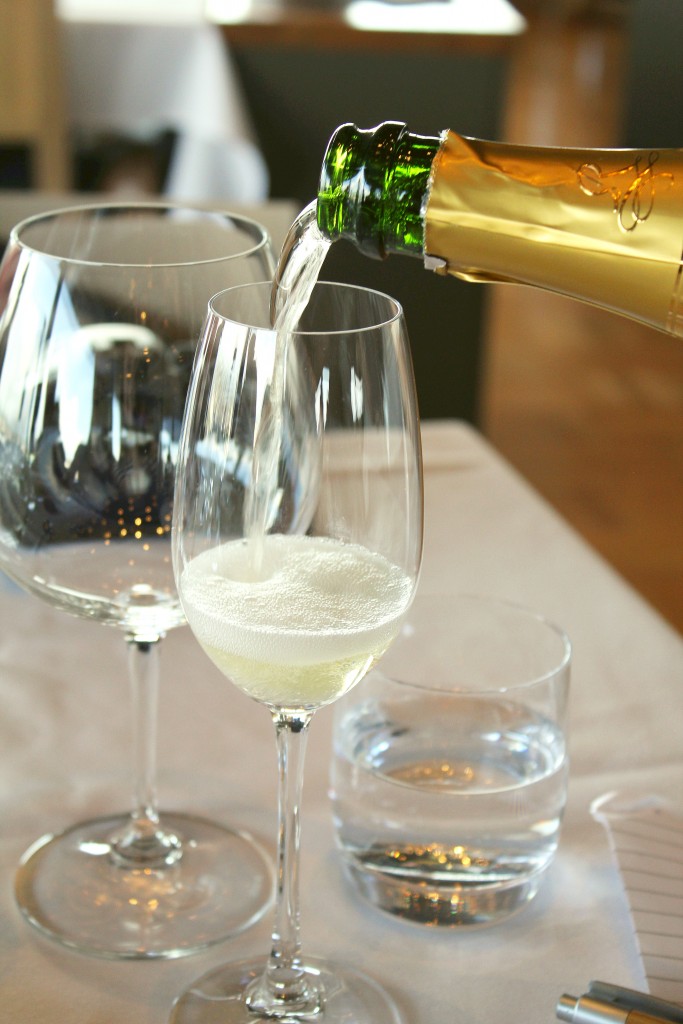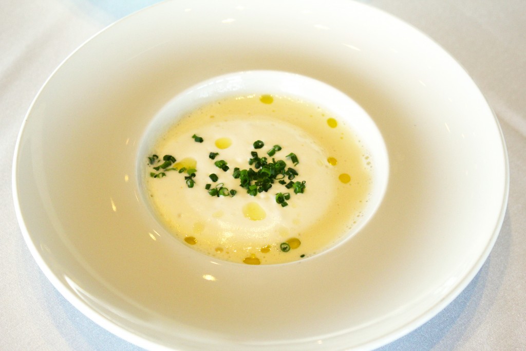 Sanottakoon heti, että Näsinneulan viinikattaus antoi mahtavan läpileikkauksen etenkin Rieslingeistä. Aloitimme illan kuohuvalla Raumland Riesling Brutilla. Viinissä oli paljon pirteitä kuplia ja jopa samppanjamaista tuoksua. Aperitiivin jälkeen siirryimme alkuruokaan, joka oli kuohkea keitto valkoisesta parsasta. Keiton pinnalla oli rapsakkaa ruohosipulia. Keiton koostumus oli upea: napakan kuohkea, mutta ei liian rasvainen.