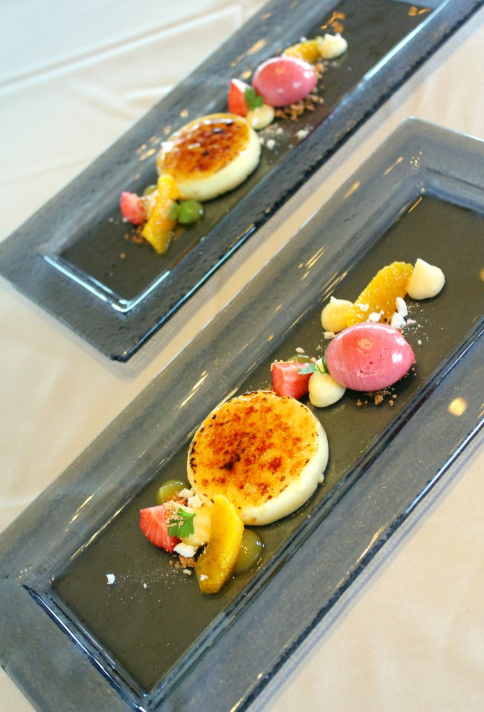 Jälkiruoaksi saimme klassisen crème brûléen Heikkilän mansikoiden ja valkosuklaan kera. Vanukkaan koostumus oli täydellinen. Pinta lohkesi hienosti ja sisus oli pehmeä, mutta ei vetelä. Mansikoiden kanssa ei kikkailtu liikaa, ja esillepano oli suloinen. Tähtianis antoi annokseen persoonallista potkua. Jälkkärin kera tarjottiin Eisweinia, elegantin appelsiinista Weingut Friedrich Beckeriä. Makeus ei onneksi vihlonut hampaita.