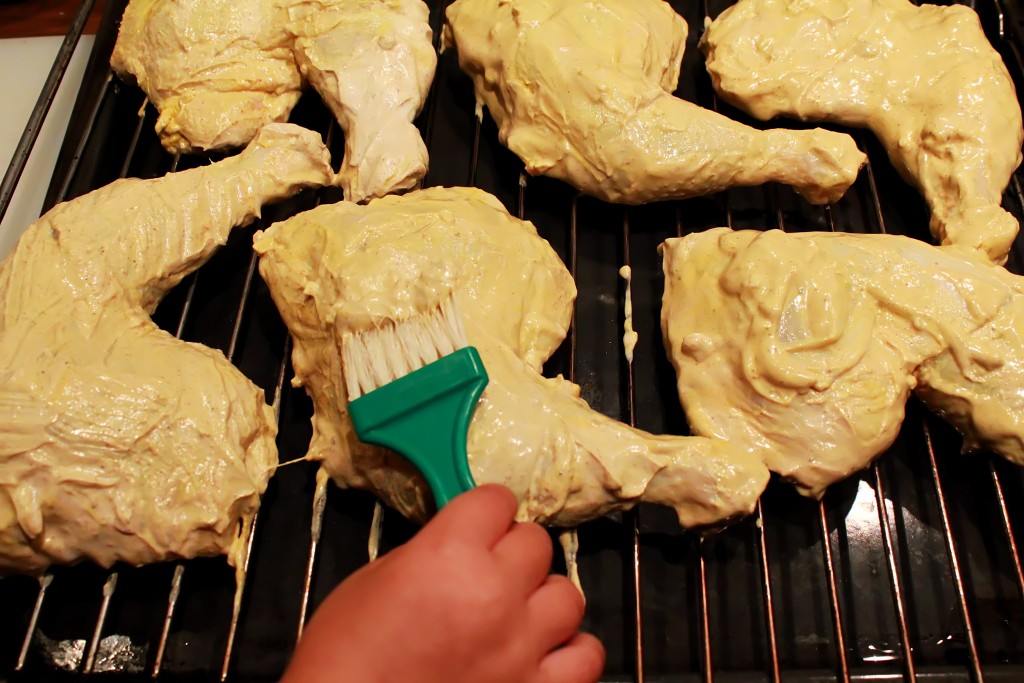 - Tee seuraavaksi toinen marinadi. Jos käytät tavallista luonnonjugurttia, valuta se esimerkiksi suodatinpussissa, jotta ylimääräinen neste valuu pois. Turkkilainen jugurtti on niin paksua, että sitä ei tarvitse valuttaa. Lisää mausteet ja öljy marinadiin ja sekoita hyvin. Sivele jugurttimarinadi koipien päälle. Anna koipien maustua jääkaapissa ainakin neljä tuntia, mieluiten yön yli.