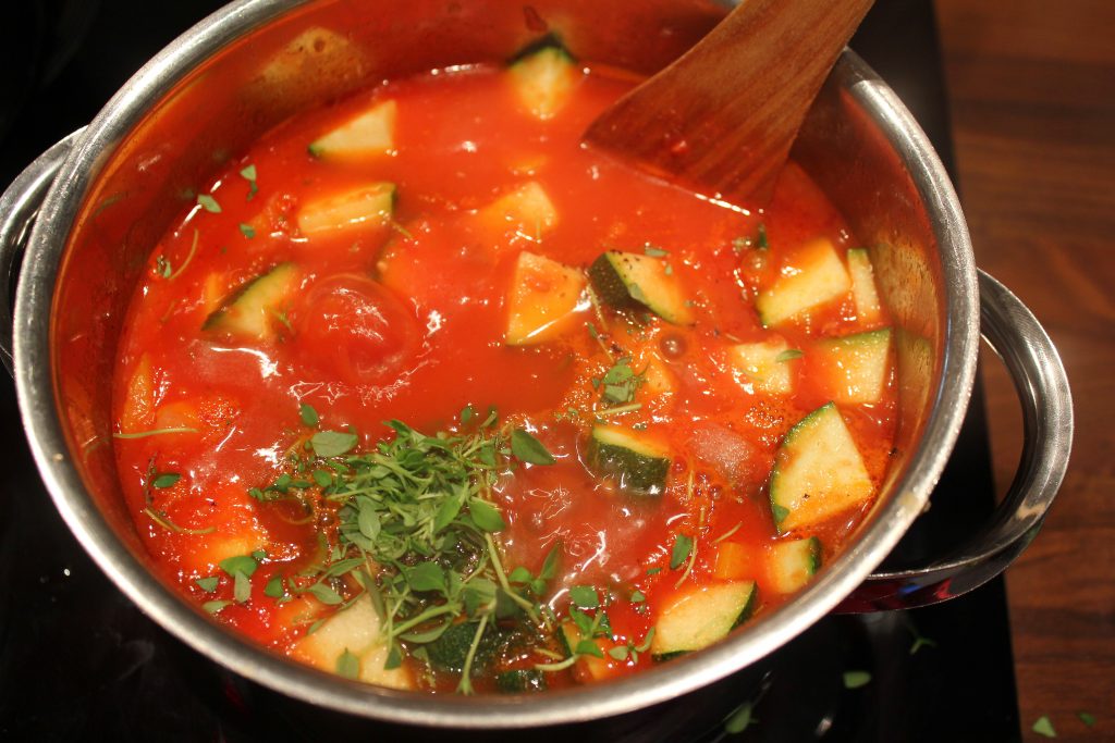 - Keitä kastiketta, kunnes myskikurpitsa on pehmeää, mutta vielä pureksittavaa. Lisää tässä vaiheessa joukkoon nopeasti kypsyvä kesäkurpitsa ja keitä vielä muutama minuutti. Kaada lopuksi joukkoon härkis. Mausta kastike timjamisilpulla, valkoviinietikalla, suolalla, sokerilla ja mustapippurilla. Voit käyttää sokeria lähes yhtä paljon kuin suolaa. Se taittaa tomaatin happoja ja syventää makuja.