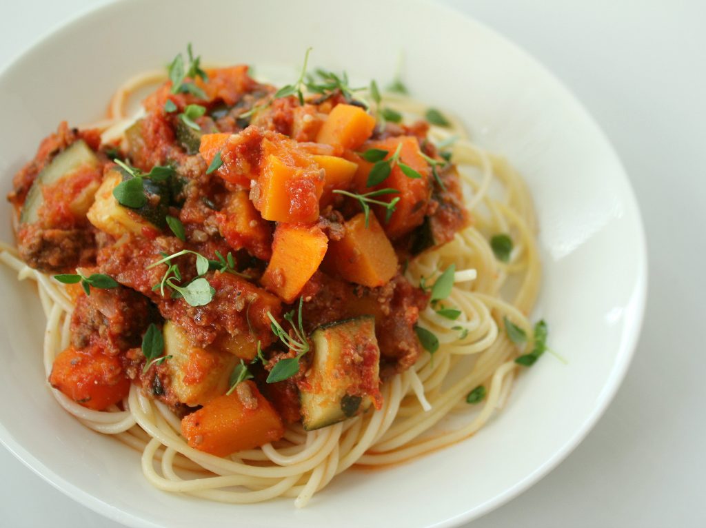 Päätin aloittaa härkiskokeiluni turvallisesti bolognesesta. Kauppoihin alkaa hiljalleen tulla ihanan värikkäitä kurpitsoita. Ryyditin tomaattikastikkeen myski- ja kesäkurpitsalla. Päälle runsaasti tuoretta timjamia ja vitsit, mikä tuoksu ja mitkä sävyt! Tästä ruoasta tuli hyvässä mielessä syksyinen olo.