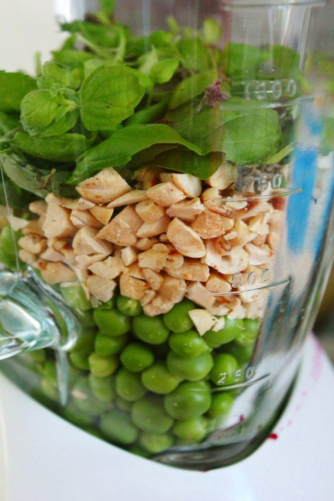 Lisäksi korvasin mantelit cashewpähkinöillä, jotka olivat lähikaupassa halvempia. Pesto ei siis vaadi onnistuakseen pinjansiemeniä, joiden hinta huitelee pilvissä. Harkitsin hetken myös valkosipulia, mutta luovuin ideasta. En halunnut, että se jyräisi herneen herkän maun päälle.