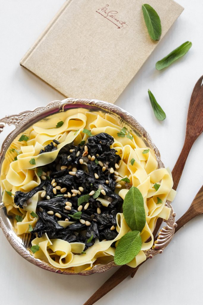 Valitukseni oli sen verran surkeaa, että Minna lahjoitti minulle litran mustatorvisieniä. Ne sopivat kuulemma erityisesti pastaan. Ja kuten olette ehkä huomanneet, pasta on lempiruokani, arjen pelastaja ja viikonlopun juhlistaja. Sain niin älyttömän hyvää palautetta vegaanisesta munakoiso-saksanäpähkinäpastasta, että päätin tehdä taas vegepastan. Koska en käyttänyt juustoa, loin vegaaniseen pastaan täyteläisyyttä kaurakermalla ja pinjansiemenillä.