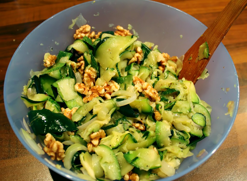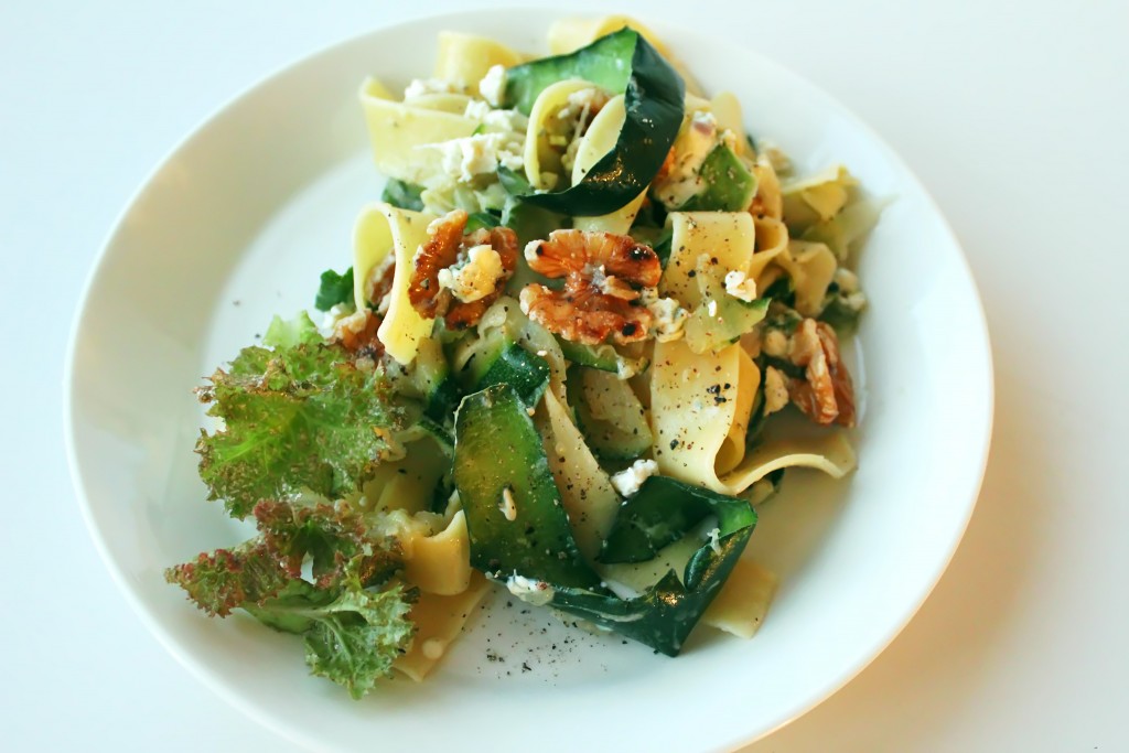 Halusin tehdä ruoan, jossa kesäkurpitsa olisi pääosassa. Halusin korostaa sen vienosti pähkinäistä, täyteläistä makua, ja mikäs olisikaan parempi runko pehmeälle paahteisuudelle kuin tukeva pasta. Päätin yhdistää kesäkurpitsan saksanpähkinään ja taittaa täyteläisyyttä suolaisella sinihomejuustolla. Vuolin kesäkurpitsan pitkiksi, leveiksi nauhoiksi juustohöylällä. Pastasta tuli erittäin ruokaisa ja siinä oli ihanasti suutuntumaa, kun käytin leveää tagliatellea.