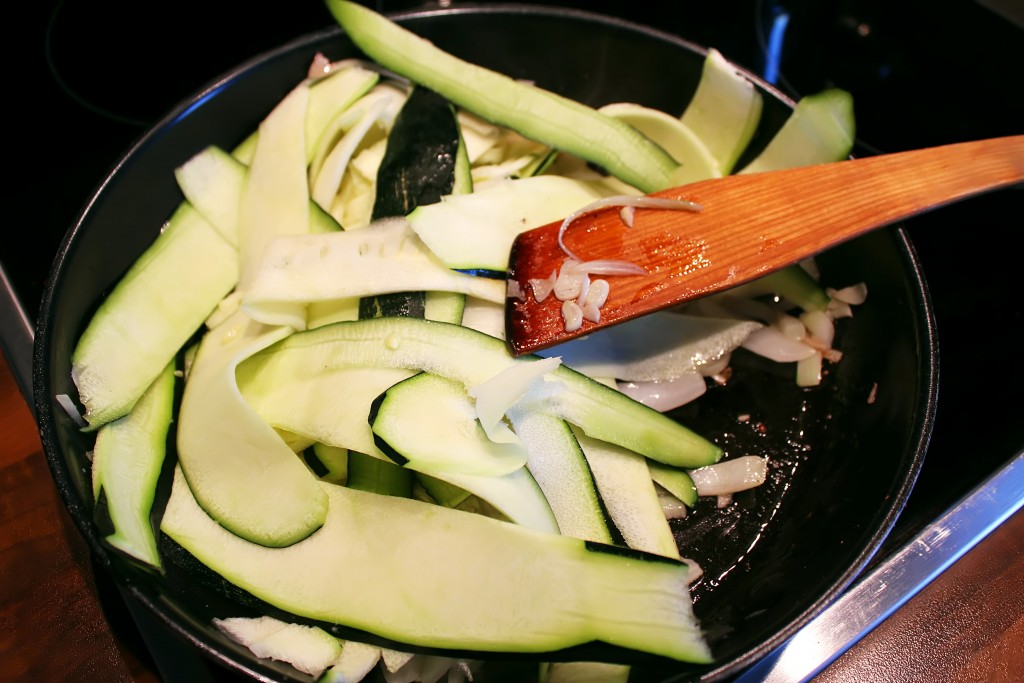 3. Vähennä lieden lämpöä keskilämpöön ja kuumenna pannulla oliivi- tai rypsiöljyä. Kuullota kelta- ja valkosipulia muutama minuutti. Varo, ettei valkosipuli pala. Freesaa kesäkurpitsa pannulla parissa, kolmessa erässä. Siirrä kuullotettu kurpitsa omaan astiaansa odottamaan.