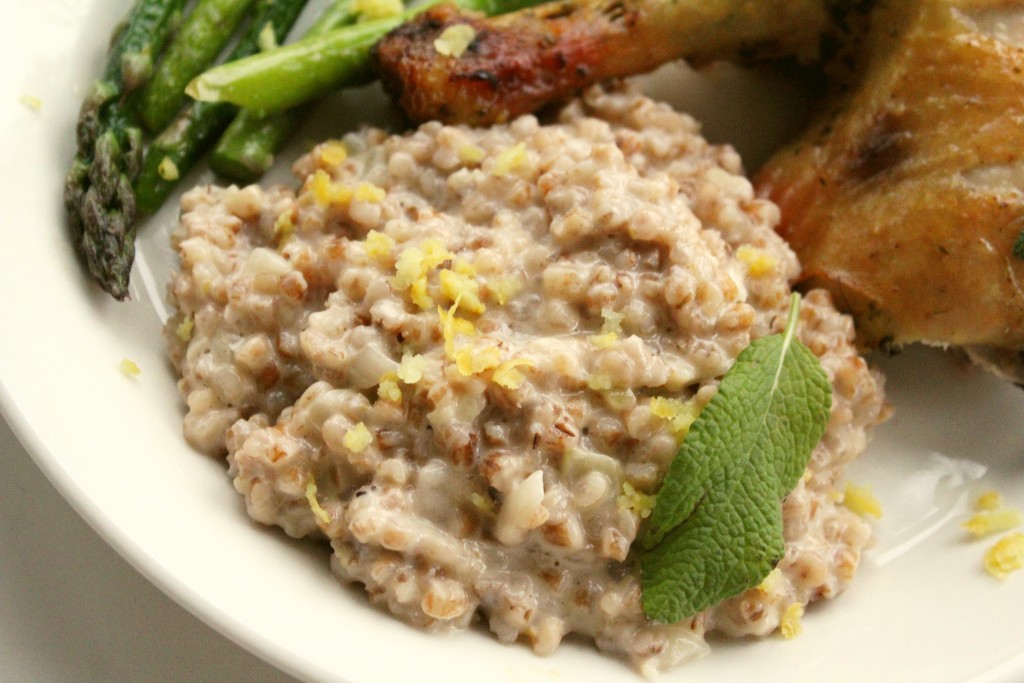 Sävelsin yrttien jämistä täysin improvisoidun marinadin, jossa oli paljon salviaa ja timjamia sekä hieman sitruunaa. Lisukkeeksi teimme mascarponella pehmennettyä ohrattoa, joka sai myös hieman raikkautta sitruunasta. Ja kasviksiksi mitäs muutakaan kuin parsaa.