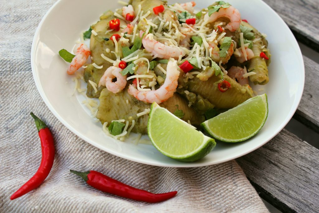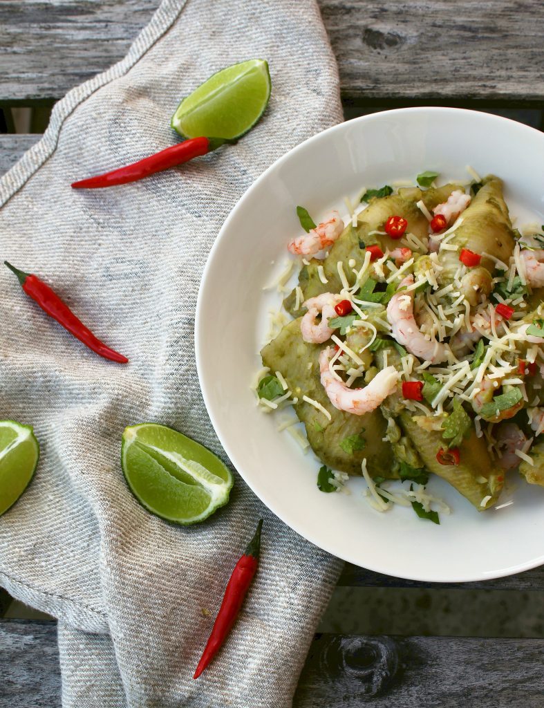 Hanna ja Alexander Gullichsenin tutuksi tekemässä originaalireseptissä on hieman chilin antamaa potkua, limeä ja paria voimakasta juustoa. Halusin virittää makumaailman vielä selvästi latinompaan suuntaan. Tein pastakastikkeesta eräänlaisen guacamolen ja peston sekoituksen. Lotrasin surutta limellä, käytin enemmän chiliä ja raikastin kokonaisuuden korianterilla. Kaipasin myös proteiinia, joten paahdoin joukkoon katkarapuja.