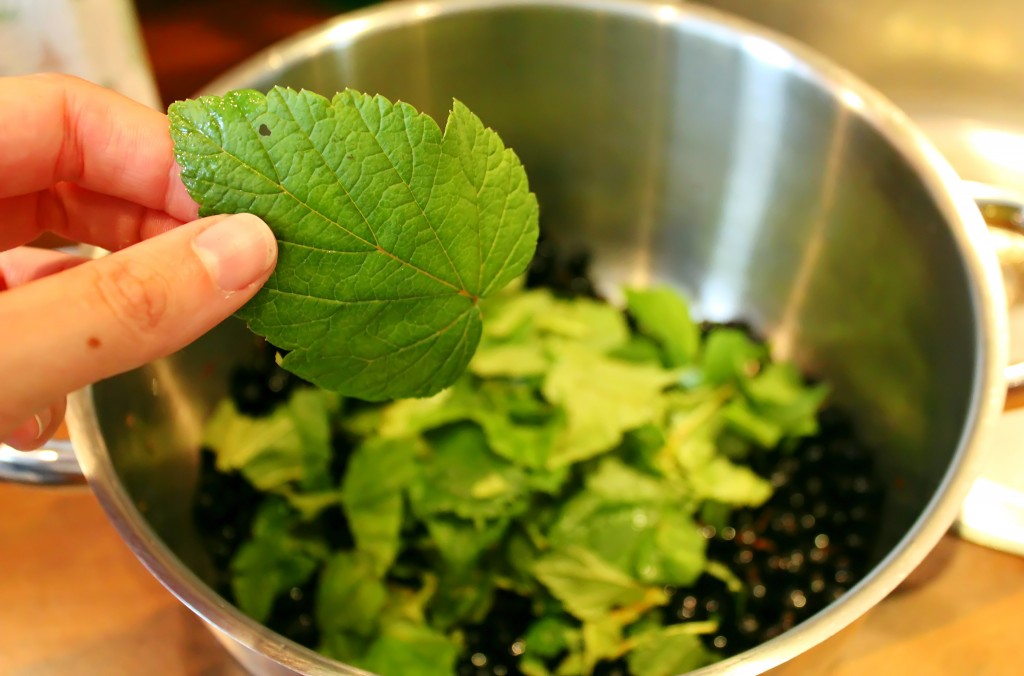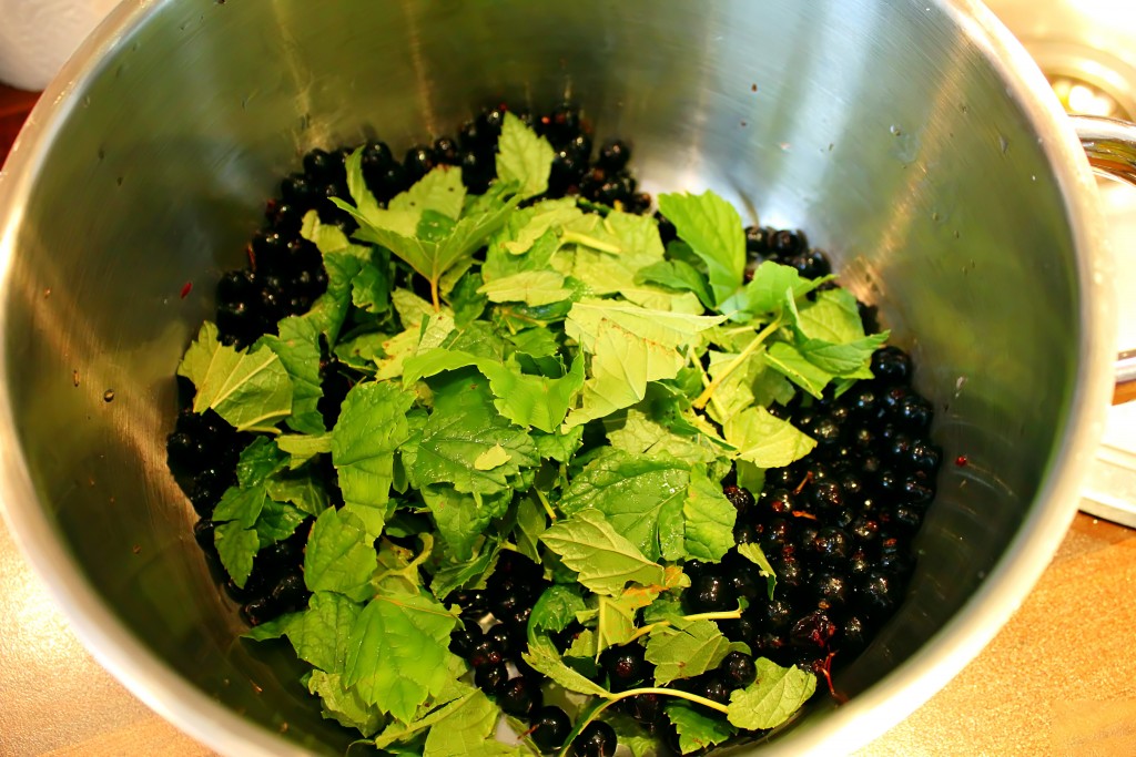 - Puhdista marjat ja pane ne suureen kulhoon tai kattilaan, joka mahtuu jääkaappiin. Revi marjojen joukkoon mustaherukan lehdet ja riko marjat survimella, nuijalla tai vastaavalla. Kaada marjasoseen joukkoon viini, peitä astia kelmulla ja anna seoksen tekeytyä jääkapissa 2−3 vuorokautta.
