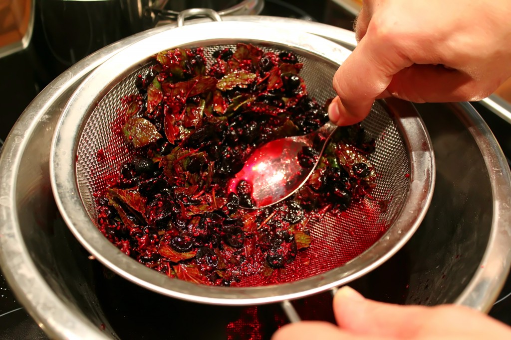- Siivilöi marjamäski juomasta kaatamalla nestettä siivilän läpi hitaasti toiseen astiaan. Painele marjamössöä välillä haarukalla, jotta saat kaiken mäskiin imeytyneen nesteen talteen.