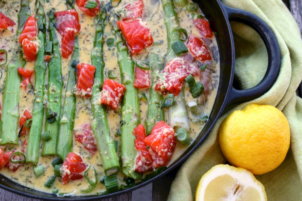 - Jos paahdat munakkaan uunissa paistinpannussa, kaada lohikuutiot ja muna-kermaseos tässä vaiheessa pannulle. Jos sinulla ei ole uunipaistoon soveltuvaa valurautapannua, kaada parsa-sipuliseos uunivuokaan, lisää joukkoon lohikuutiot ja munaseos.