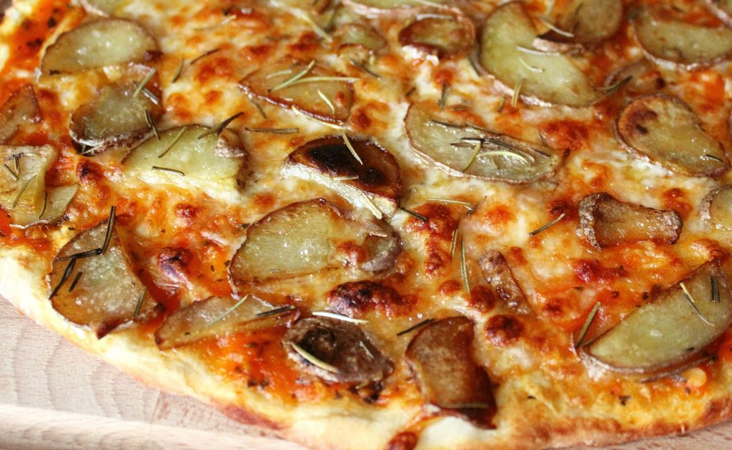 En tingi mehevyydestä, joten pizzaan tulisi vaalea kastike keltaisista tomaateista. Täytteeksi ohuita rosmariinilla ja suolalla maustettuja perunasiivuja, juustoa ja vähän kaprista. Lisukkeeksi nokare hapankermaa.