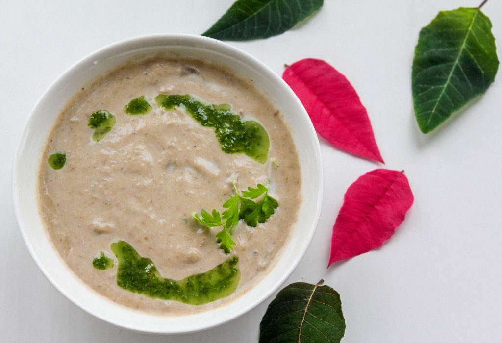 - Koristele annos meiramilla ja kirvelillä. Jos yrtit ovat tuoreita, voit tehdä keiton päälle koristeöljyn surauttamalla yrttejä ja öljytilkan pestoksi tehosekoittimessa.