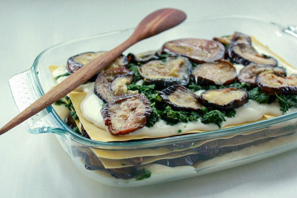 Napsin kuvia nyt vähän normaalia enemmän, jotta näette, miten minä kerrostin täytteet. Tästä lasagnesta tulee aika tiivis ja napakka, se ei siis ui kastikkeessa. Koostumus ei kuitenkaan ole kuiva. Pinaatti ja öljyssä paahdettu munakoiso ovat niin kosteita, että levyt kyllä kypsyvät hyvin, eikä lasagnesta tule kuivaa.