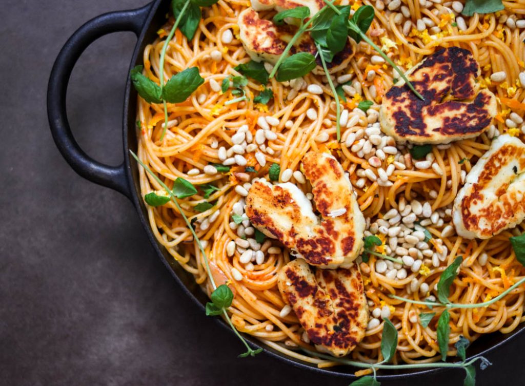 Pasta on vegaaninen, mutta paistoin lisukkeeksi ensimmäisellä kerralla halloumia. Toisella kerralla vetelin pastaa ihan sellaisenaan. Toimii sekä karsittuna versiona että lisukkeiden kanssa.