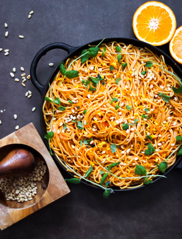 Pestopastan nerokas yksinkertaisuus tuli mieleeni, kun löysin Recipes from a Pantry -blogin harissapastan ohjeen. Bintun luottopastaan tulee vain pastaa ja harissakastiketta, lisukkeeksi pinjansiemeniä ja appelsiinilohkoja. Kokkailutaitoni ovat kohentuneet sen verran, että päätin kehitellä reseptiä hieman.