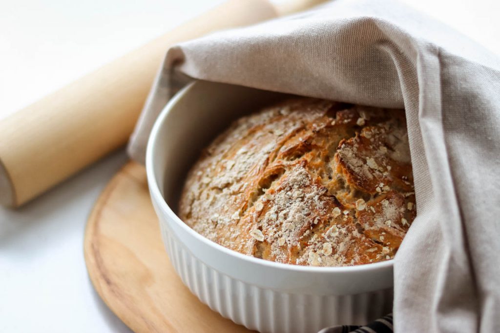 - Kun uuni ja astia ovat lämmenneet, nosta astia patakintailla ulos, pane taikinapallo astiaan ja peitä kannella. Paista leipää ensin kannen kanssa 30 minuuttia. Ota kansi pois ja anna leivän ottaa vielä väriä pintaan 15 minuuttia.