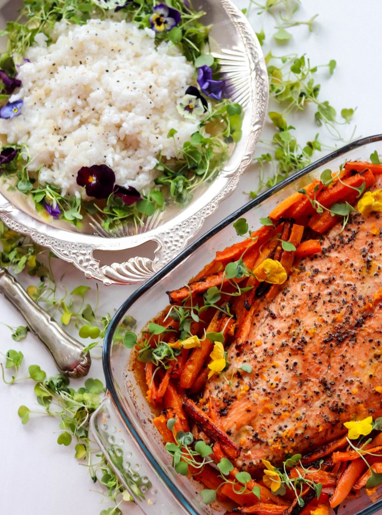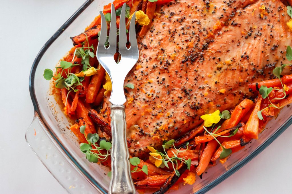 VINK VINK VINK: Juurekset kannattaa esivalmistella ensin ja panna uuniin parikymmentä minuuttia ennen lohta, sillä ne kypsyvät hitaammin. Voit korvata porkkanat tai paahtaa niiden lisäksi myös bataattia tai kurpitsaa.