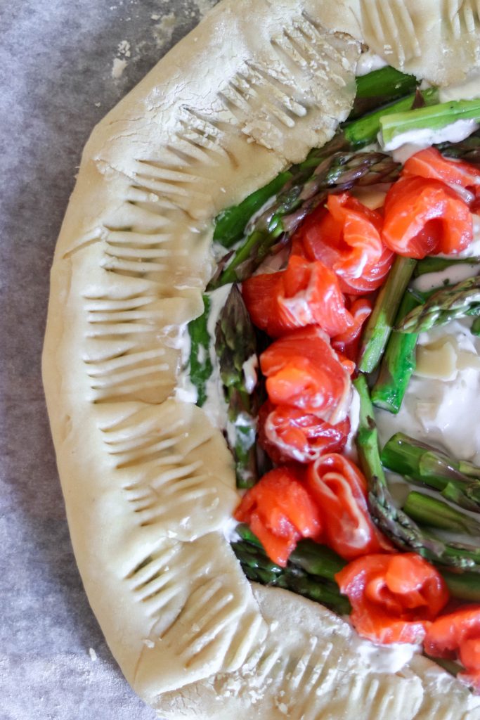VINK VINK: Jos haluat täytteeseen enemmän värivaihtelua ja kalaa, käytä 300 grammaa lohta ja 2/3 parsanipusta. Koska rakastan parsaa ja sesonki on lyhyt, halusin, että parsa on pääosassa.