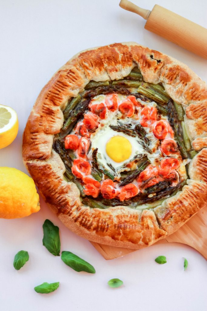 - Paista piirakkaa 225 asteessa uunin alatasolla ensin 20 minuuttia. Ota piiras hetkeksi pois uunista, ja asettele parsanpalat ja rulliksi pyöräytety lohisiivut pyöreään muotoon täytteen päälle. Jätä keskelle pieni tyhjä kohta munaa varten. Paista 10 minuuttia, ota taas piiras pois uunista, riko muna keskellä olevaan tyhjään kohtaan ja paista vielä 5 minuuttia. Piiras on valmis, kun reunat ovat kullankeltaiset, muna hyytynyt ja fraiche napakkaa. Huomioi, että fraiche kiinteytyy vielä jäähtyessään.