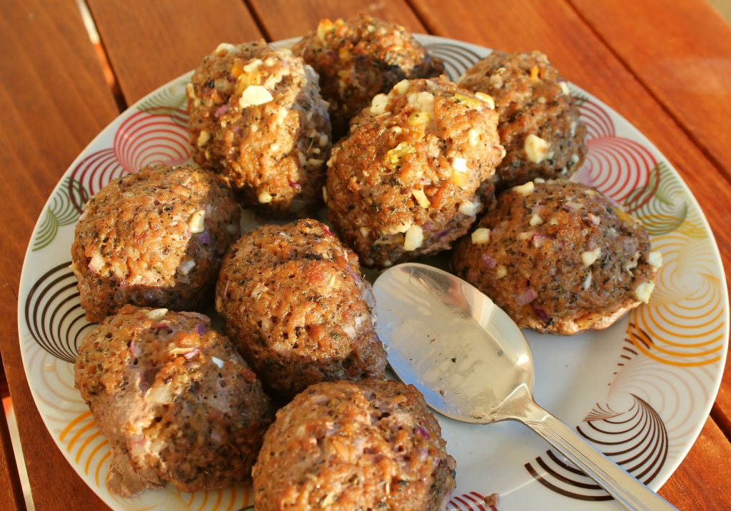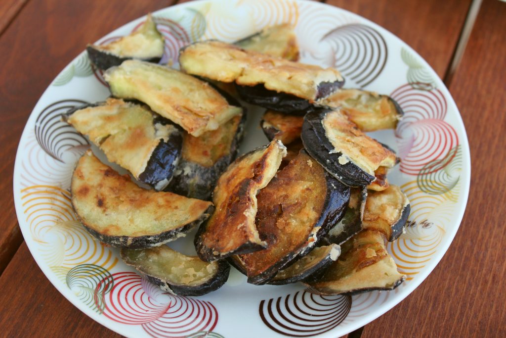 Tarjolla oli kreikkalaisia lihapullia ja monenlaisia kasvisherkkuja. Päätimme kokeilla juuston ja munakoison valmistamista perinteisellä saganaki-menetelmällä. Kaikessa yksinkertaisuudessaan: raaka-aine pyöritellään vehnäjauhoissa ja paistetaan pannulla runsaassa oliiviöljyssä.