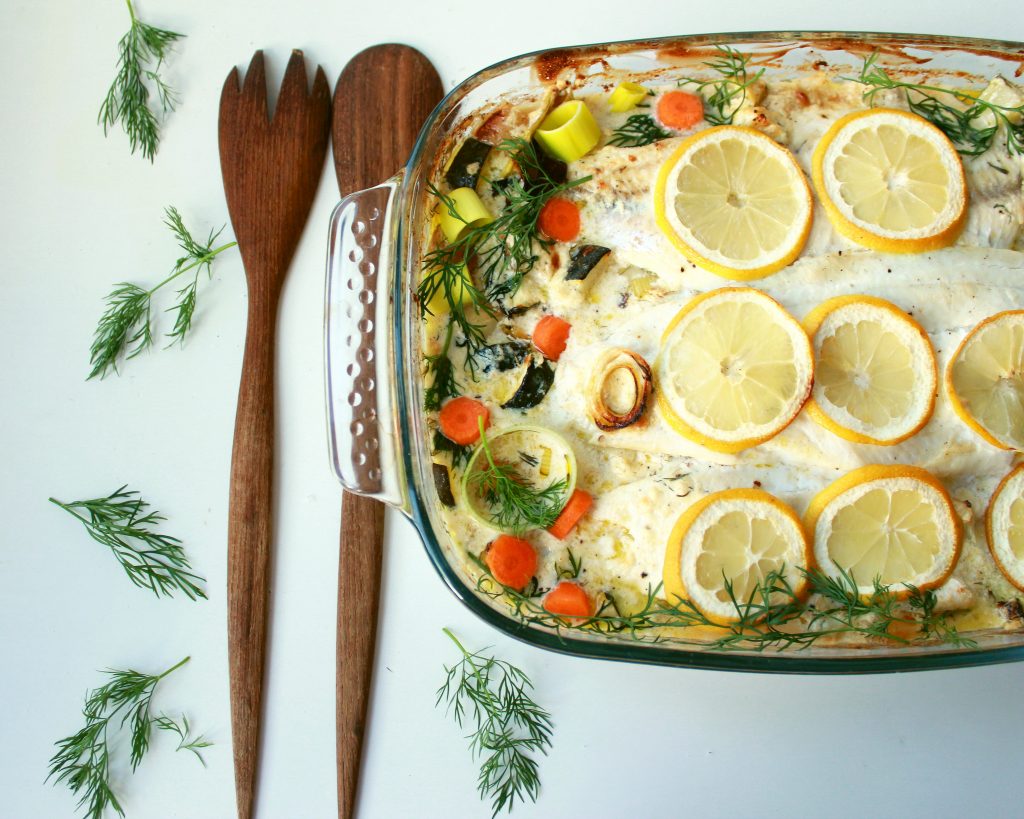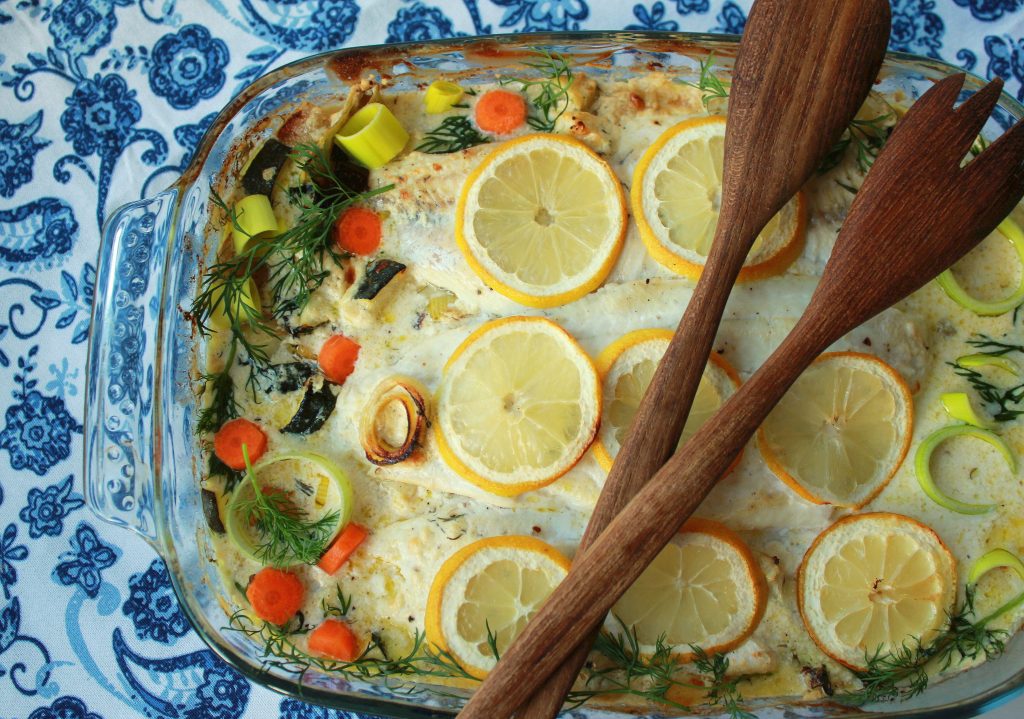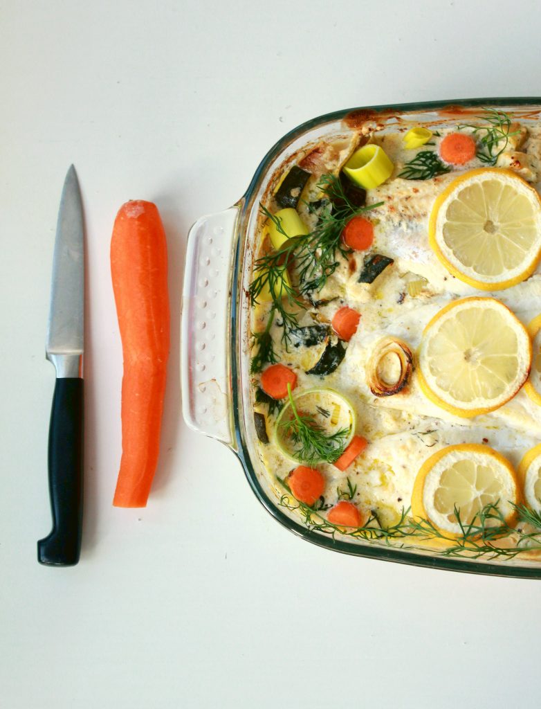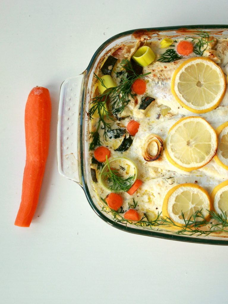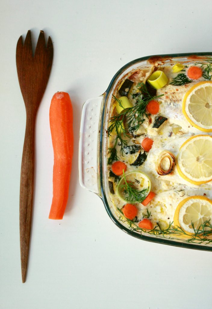 Uunikalaa ja kasviksia raikkaassa smetanakastikkeessa