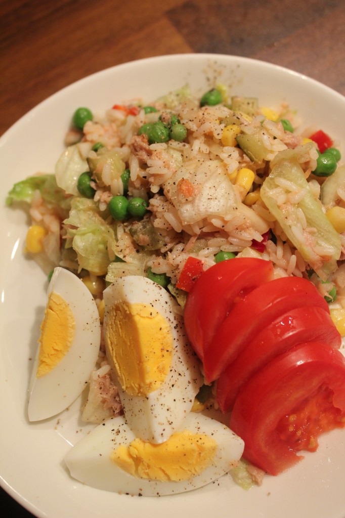 Teimme tätä salaattia ison pöntöllisen ja tuhosimme sen yhdessä illassa. Tonnikalanhimo ei kuitenkaan ollut vielä tyydytetty. Seuraavana iltana teimme taas tonnikalasalaattia, tällä kertaa tosin vanhaa kunnon opiskelijan mättömössöä. Perinteinen tonnikalasalaatti on ehkä ainoa ruoka, jota varten pakastimeemme eksyy joskus pussillinen herne-maissi-paprikaa.