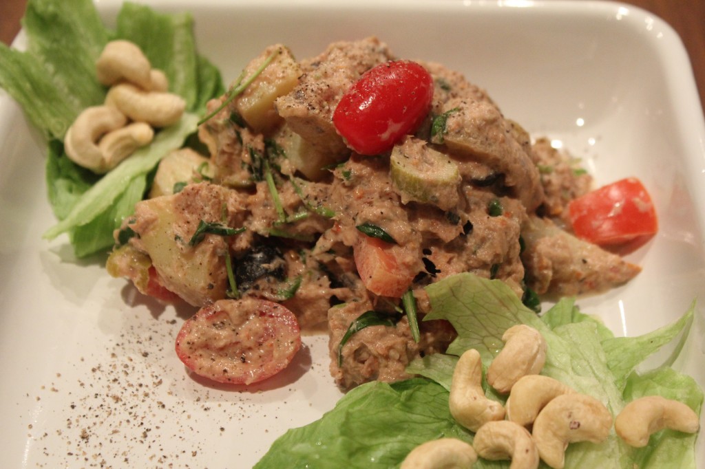 Tonnari-overload alkoi jo perjantaina lounasaikaan. Mies oli syönyt salaattia töissä ja mankui kotona, että haluaa tehdä sitä viikonloppunakin. Teimme ensimmäisenä iltana Yhteishyvän välimerellisen perunsalaatin ohjeesta varioidun versiomme, jossa on reilusti vähemmän perunaa ja enemmän herkullista tonnikalatahnaa. Lähikaupassa ei ollut yhtään syöntikypsää avokadoa, joten jätimme ne suosiolla reseptistä pois ja korvasimme avokadon cashew-pähkinöillä. Mutta käytä ihmeessä avokadoa, se sopii tähän salaattiin todella hyvin.